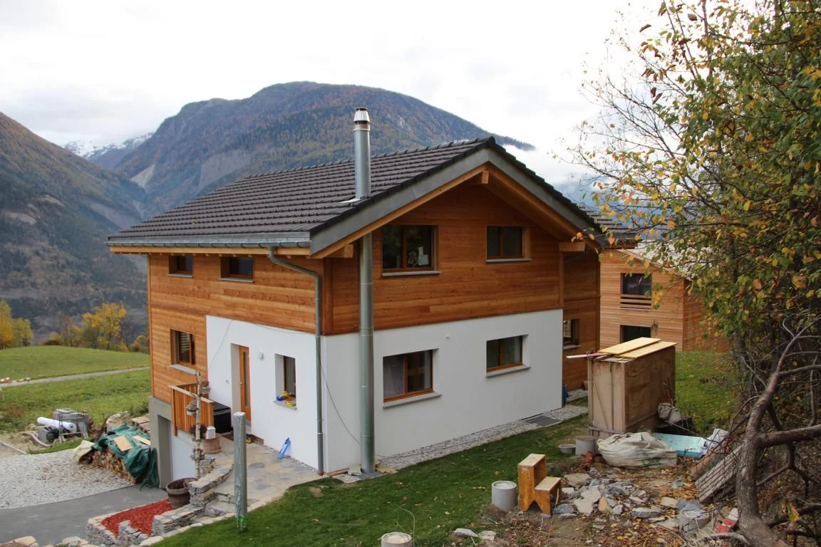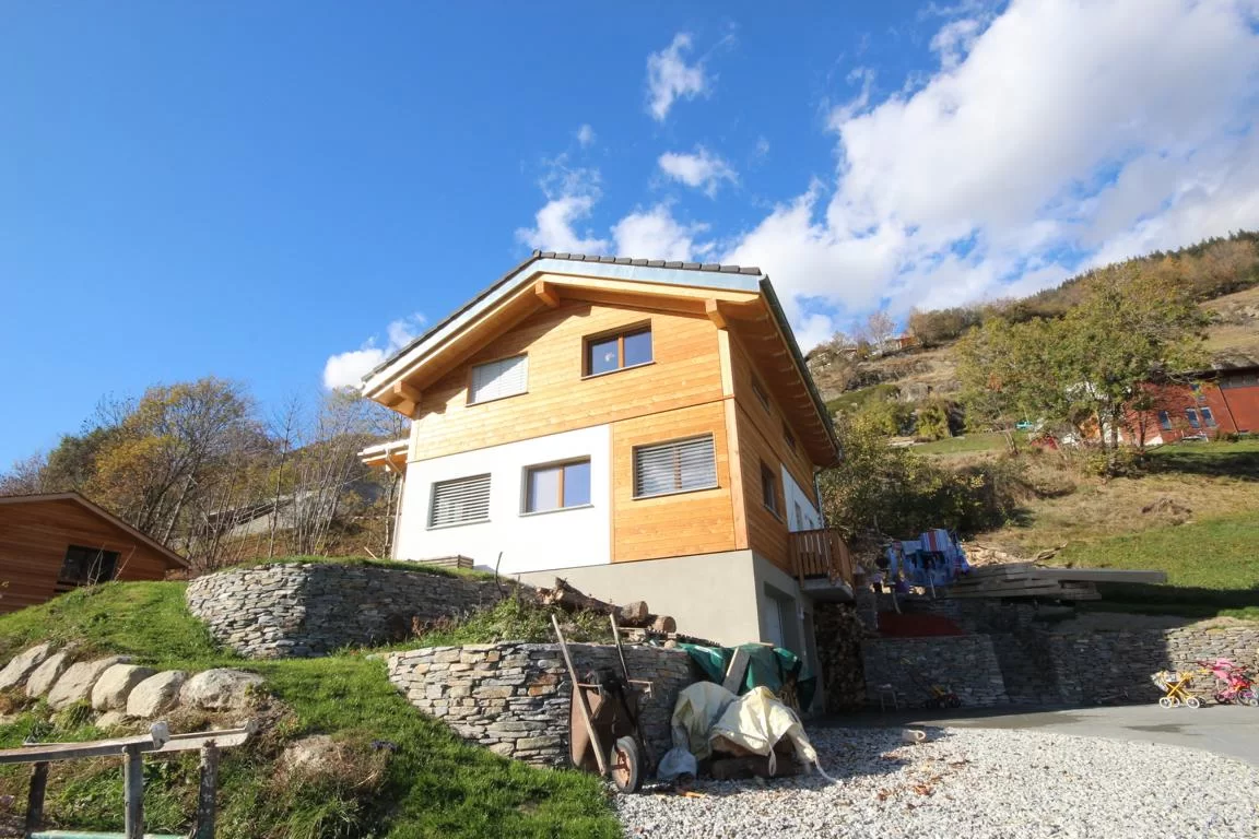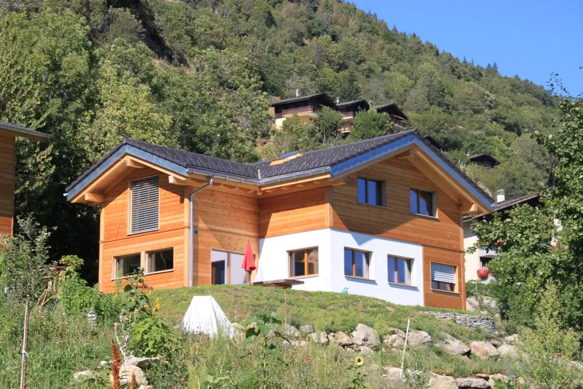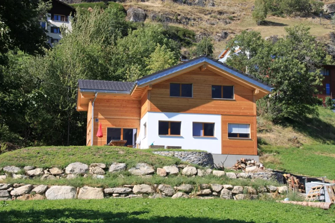 Einfamilienhaus mit Kreuzgiebeldach und Mischfassadensystem in Birgisch
