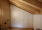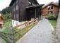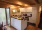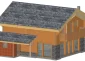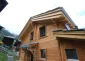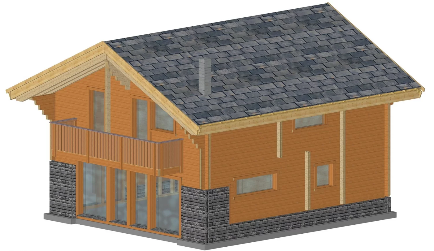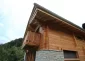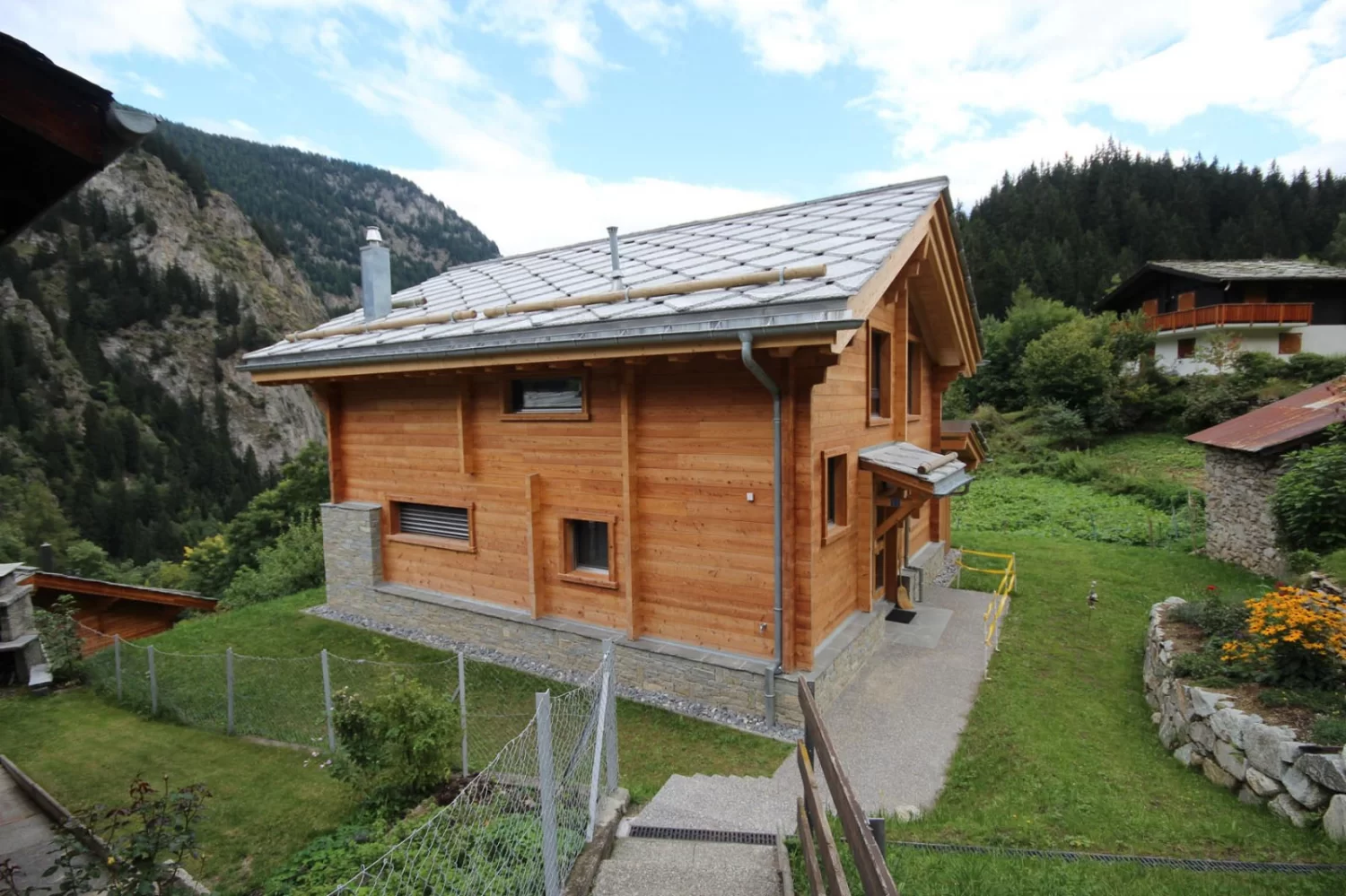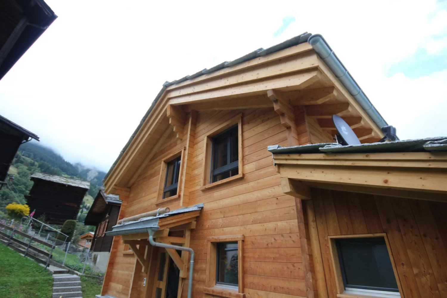 Log construction in Blatten bei Naters. Stepped exterior walls with façade brick. Roofing with natural stone tiles.
