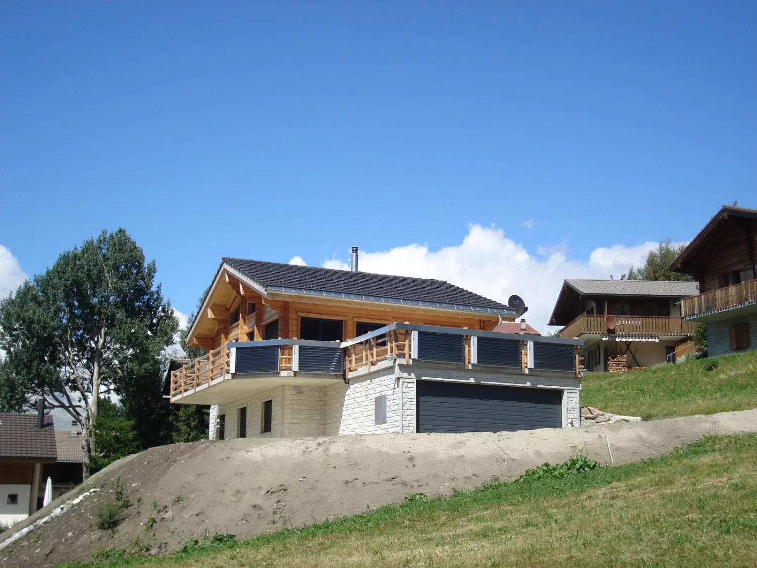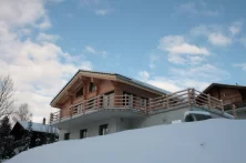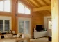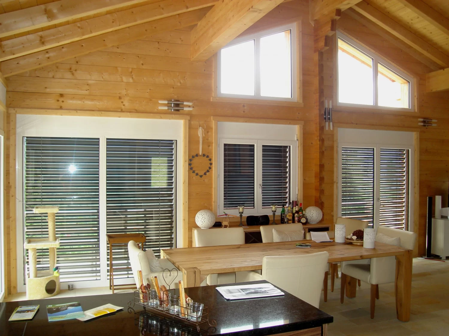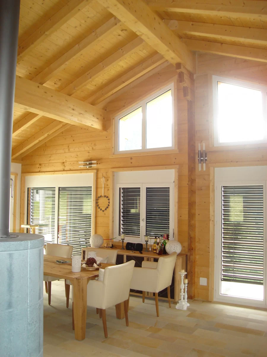 Log house with basement in Bürchen. The extensive window surface ensures a high degree of natural light. The basement was lined with façade brick.